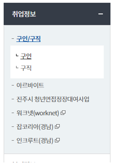 진주시의 각종 구인구직 정보를 확인할 수 있습니다. 일반 정규직 뿐 아니라, 아르바이트에 대한 구인구직 포스팅도 확인할 수 있습니다. 더하여 고용노동부와 함께 운영하는 워크넷, 그리고 경남 잡코리아, 경남 인쿠르트 등 각종 민간 채용사이트에도 접속할 수 있으므로 진주에서 일자리를 구하는 분께 특히 유용한 메뉴입니다.