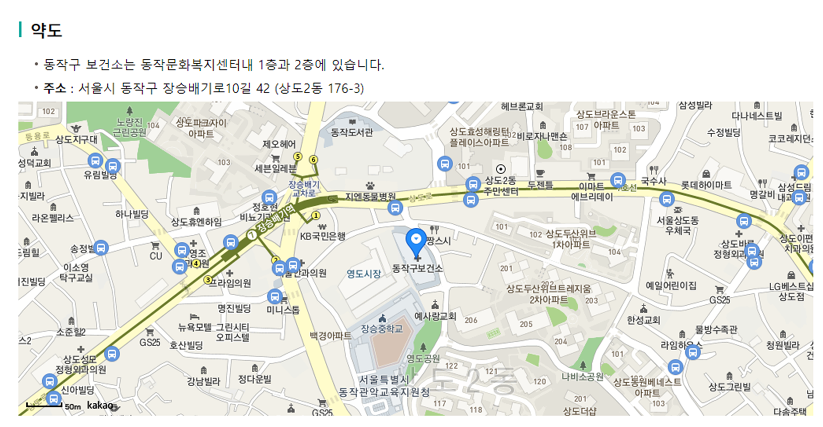 참고로 동작구 보건소는 사당동에 분소도 운영하고 있습니다. 사당로 253-3 유창빌딩 2층에 위치해 있습니다. 분소에서도 기본적인 검사나 진료는 가능하므로 사당 근처에 거주하고 계신분은 굳이 장승배기로 올 필요 없이 분소를 이용하는 것도 좋은 방법입니다.