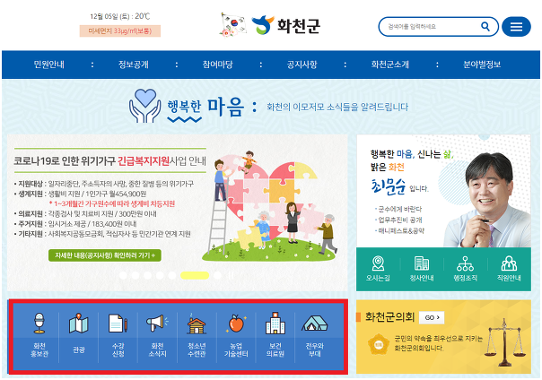 화천군청 홈페이지에 정상적으로 접속하였다면, 위와 같은 화면을 확인할 수 있습니다. 화천군 홈페이지는 화면 상단에서 확인할 수 있듯이 총 6가지의 메뉴로 구성되어 있습니다. 각 메뉴는 각각 10개가 넘는 하위메뉴로 구성되어 있으며, 자주 사용되는 메뉴는 화면 좌측 하단 (빨간색 박스친 부분)에 모여 있습니다.
