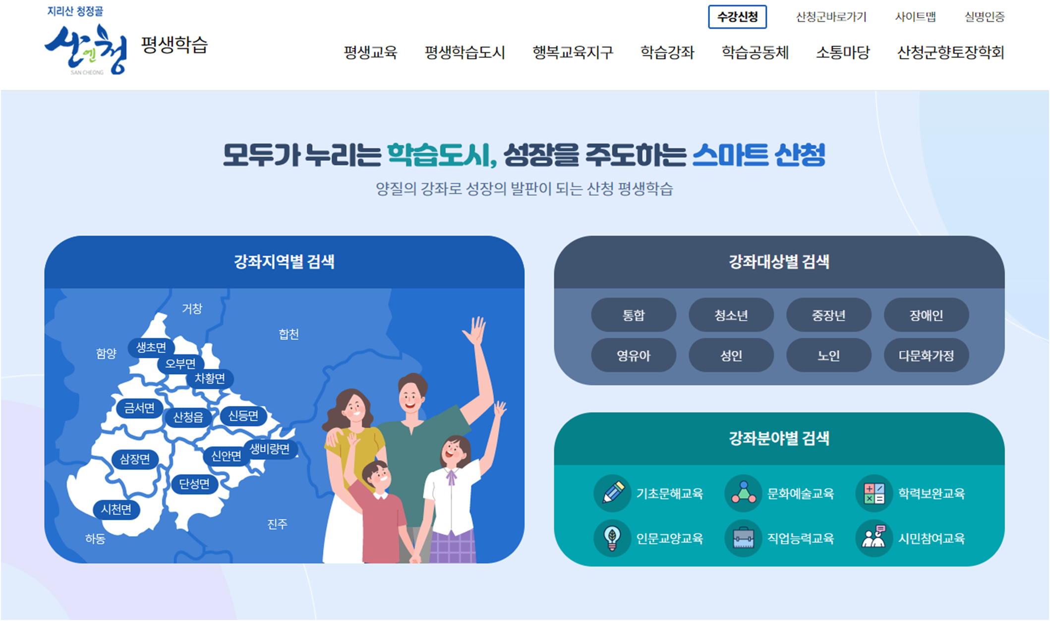 산청은 군민의 교육수준 향상을 위해 다양한 프로그램을 운영하고 있습니다. 이러한 일환 중 하나로 산청평생학습이라는 사이트를 운영하고 있는데, 영유아/청소년/성인/중장년/노인/장애인/다문화가정 등 다양한 계층을 대상으로 한 여러가지 교육과정을 제공합니다.