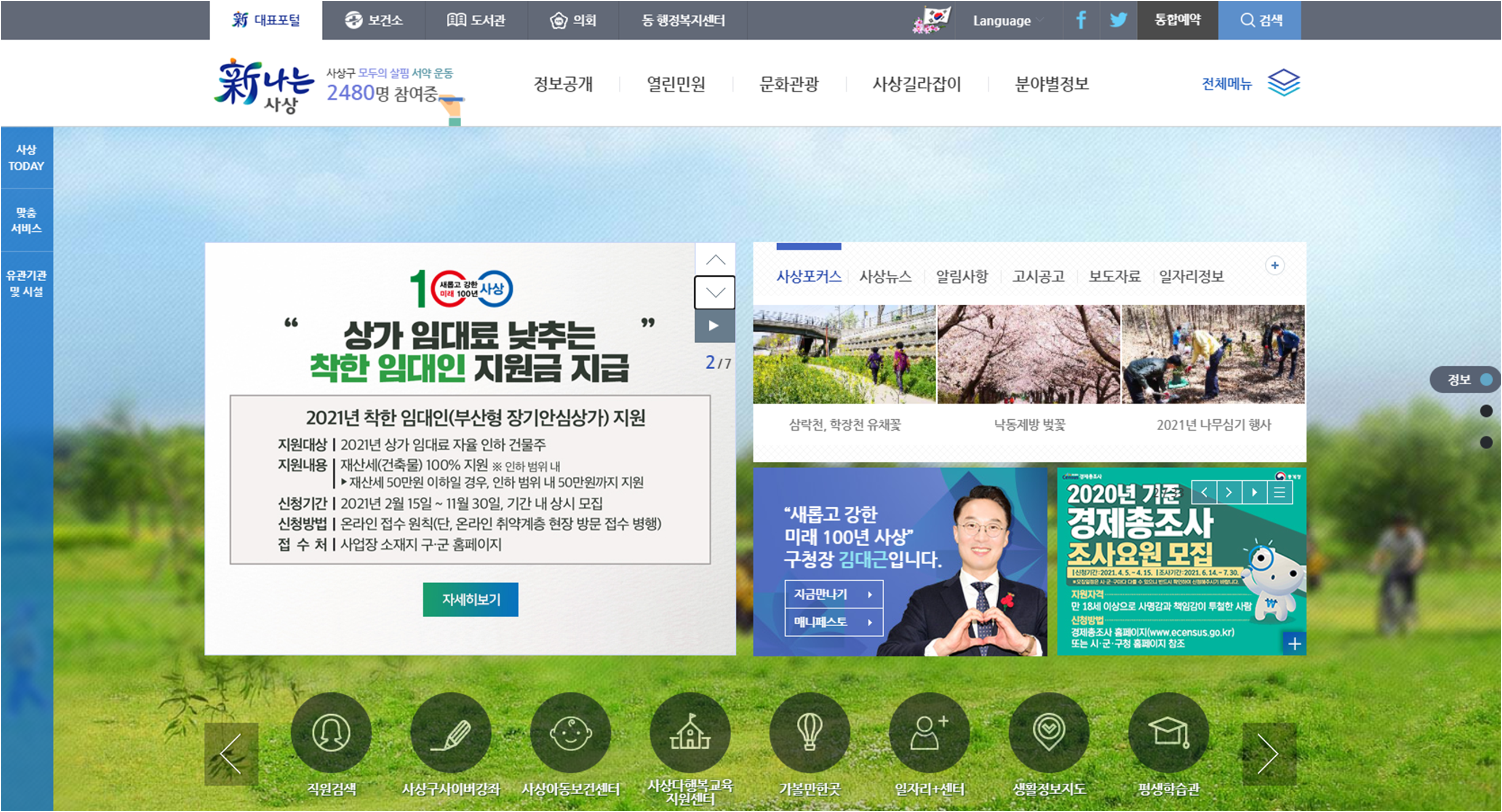 안녕하세요, 이번 포스팅에서는 "新나는 사상" 부산광역시 사상구의 구청 홈페이지 바로가기 및 이용방법에 대해 쉽게 알아보도록 하겠습니다. 사상구청 홈페이지에는 다양한 분야의 지역정보 및 서비스를 확인할 수 있기 때문에 사상구에 거주하고 계신 구민, 사상구 여행을 계획하고 계신 여행가분들께 가치있는 효용을 제공합니다.