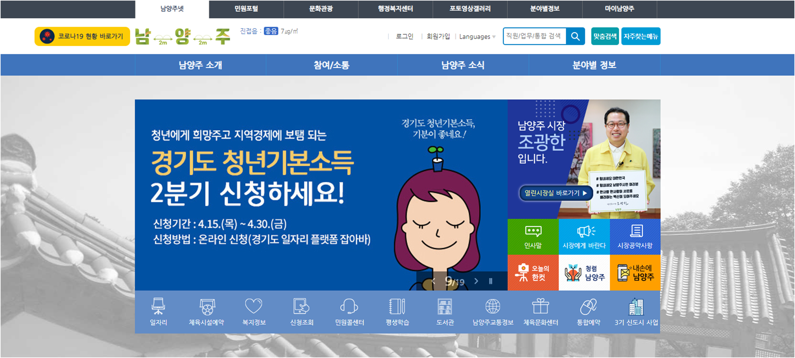 남양주시청 홈페이지에는 구민을 위한 다양한 정보와 서비스가 곳곳에 존재합니다. 이러한 정보/서비스 기능이 무려 백가지가 넘을 정도로 굉장히 많은데, 본 글에서는 그 중에서 시민들이 유용하게 이용하는 자주찾는 메뉴 5가지만 꼽아서 어떠한 내용이 있는지 한 번 확인해 보도록 하겠습니다.