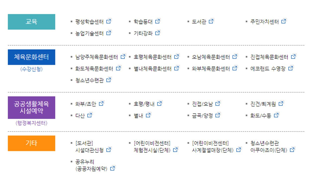 남양주가 제공하는 공공서비스를 예약할 수 있습니다. 평생학습센터, 학습등대, 주민자치센터, 농업기술센터 등에서 제공하는 교육 프로그램을 예약할 수 있으며, 각 행정복지센터에서 운영하는 공공생활체육 시설을 예약할 수 있습니다. 또한 도서관 시설, 어린이비전센터 체험전시실/사계정썰매장, 청소년수련관 아쿠아조이, 공유누리도 예약 가능합니다.