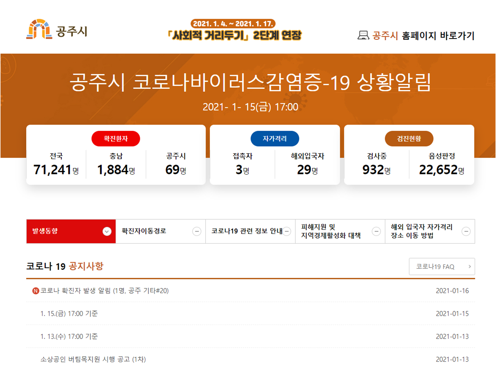 공주시에서 발생하는 코로나19 현황을 확인할 수 있는 공간입니다. 코로나 확진 현황 및 확진자 주요 이동경로에 대한 정보를 확인할 수 있습니다. 또한 선별진료소 위치 및 운영현황에 대한 정보도 확인할 수 있습니다.