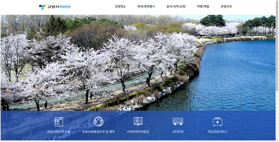 고양시청 홈페이지 화면은 위 그림과 같습니다. 기본적으로 다섯가지의 메뉴로 구성되어 있음을 알 수 있습니다.