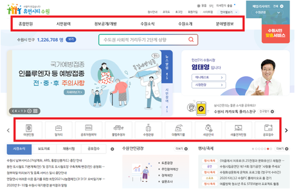 수원시청 홈페이지는 위 그림에서 보시는 것과 같이 흰 색 깔끔한 디자인으로 구성되어 있습니다. 홈페이지에서는 여러가지 기능을 제공하는 데, 주로 이용하게 되는 기능은 빨간색 박스친 부분에 주로 위치해 있습니다.