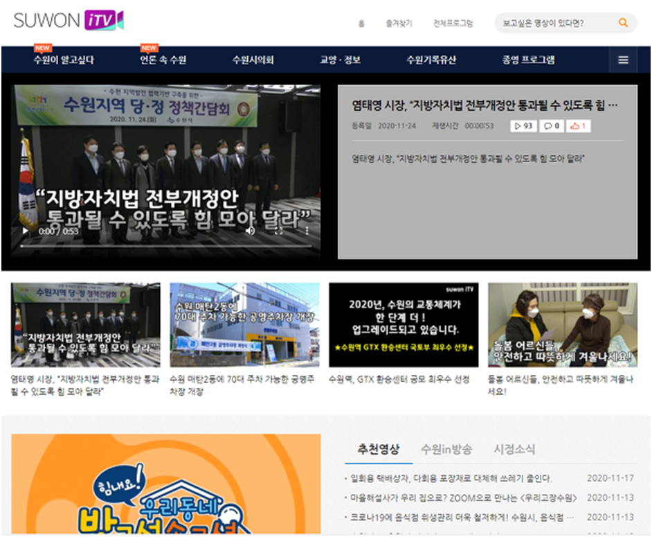 마지막으로, 수원시는 공식 홈페이지 외에 "수원iTV"라는 이름의 인터넷 방송을 운영하고 있습니다. 수원인터넷방송에서는 생생한 지역소식 뿐 아니라, 다양한 교양/정보 자료, 그리고 수원시에서 운영하는 행사 동영상 등을 확인할 수 있으므로 관심있으신 분은 한 번 확인해 보시길 바랍니다.