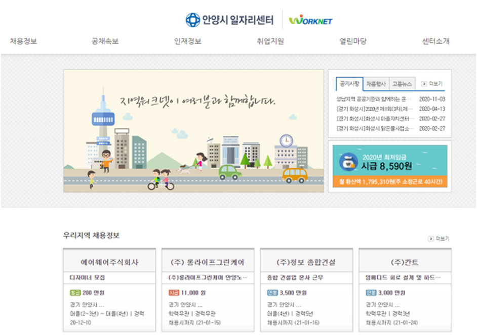 안양시는 만안구와 동안구에서 별도의 일자리센터를 운영하고 있으며, 시청 홈페이지를 통해 WORKNET이라는 이름의 안양시 일자리센터 사이트도 접속이 가능합니다. 일자리센터 사이트에서는 다양한 채용정보를 확인할 수 있으므로, 안양지역에서 일자리를 찾고 있는 분이라면 유용하게 활용할 수 있습니다. 시에서 운영하는 다양한 취업지원 프로그램 신청도 이 곳에서 할 수 있다는 점도 참고하시길 바랍니다.