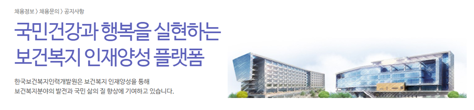한국보건복지 인력개발원은 전문적이고 체계적인 교육사업을 통해 보건복지 전문인재를 양성하는 기관입니다. 보건복지보 본부 및 소속관에, 질병관리청, 식약처 및 각 시도 보건의료 분야 종사자 등을 대상으로 다양한 교육 제공하고 있습니다.