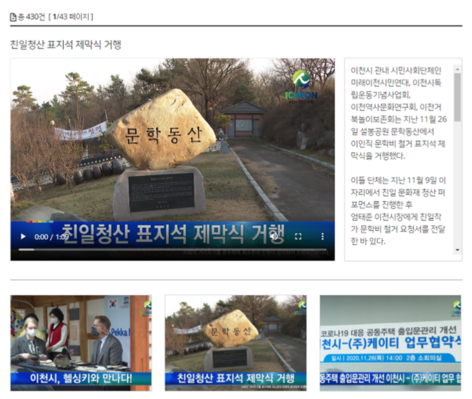 또한 이천시는 자체적으로 이천뉴스 및 유튜브 채널을 운영하며 시민과 소통하고 있습니다. 이러한 내용은 홈페이지 메인화면 가장 하단에서 확인할 수 있습니다. 이러한 컨텐츠는 일부 홈페이지 상단의 "이천소식"에서 확인할 수 있는 컨텐츠와 중복되는 면이 있지만, 텍스트 위주로 제공되는 다른 기능들과 달리 영상 위주로 정보가 제공되므로 보다 보기 편하다는 점 참고하시길 바랍니다.