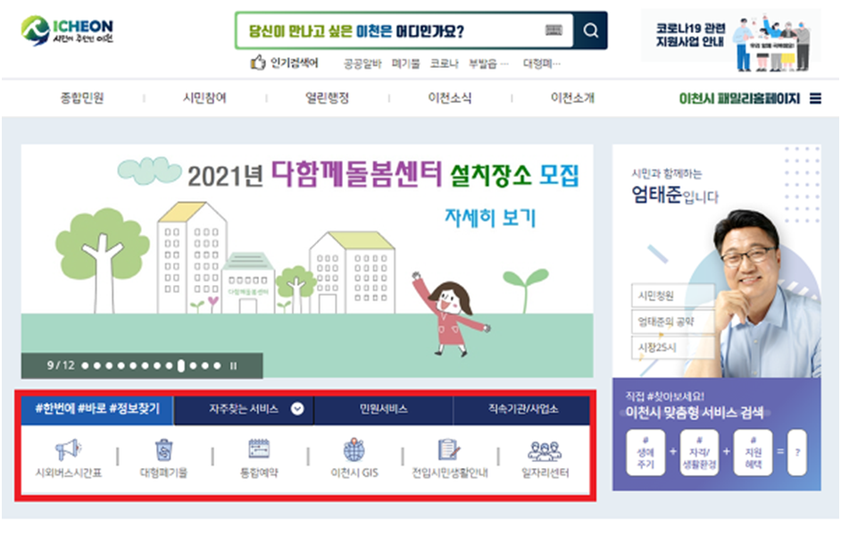 사이트 메인화면은 위 모습과 같습니다. 이천시청에서 이용할 수 있는 모든 컨텐츠는 화면 상단 메뉴란을 통해 모아져 있으며, 그 중에서도 자주 이용하는 서비스는 화면 하단의 자주찾는 서비스 및 아이콘을 통해 보다 간편하게 이용할 수 있습니다 (빨간색 박스친 부분).