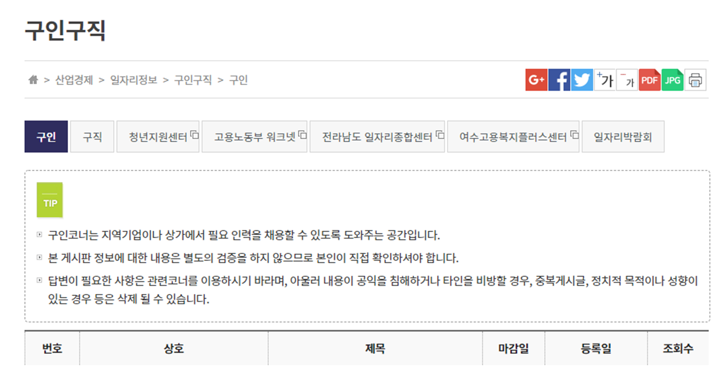 또한 여수시청에서 관리하는 일자리 정보를 확인할 수 있습니다. 다양한 구인구직 포스팅을 이 곳에서 확인할 수 있기 때문에 일자리를 구하고 있는 분이라면 주기적으로 방문하여 새로운 정보를 확인하면 도움이 됩니다.
